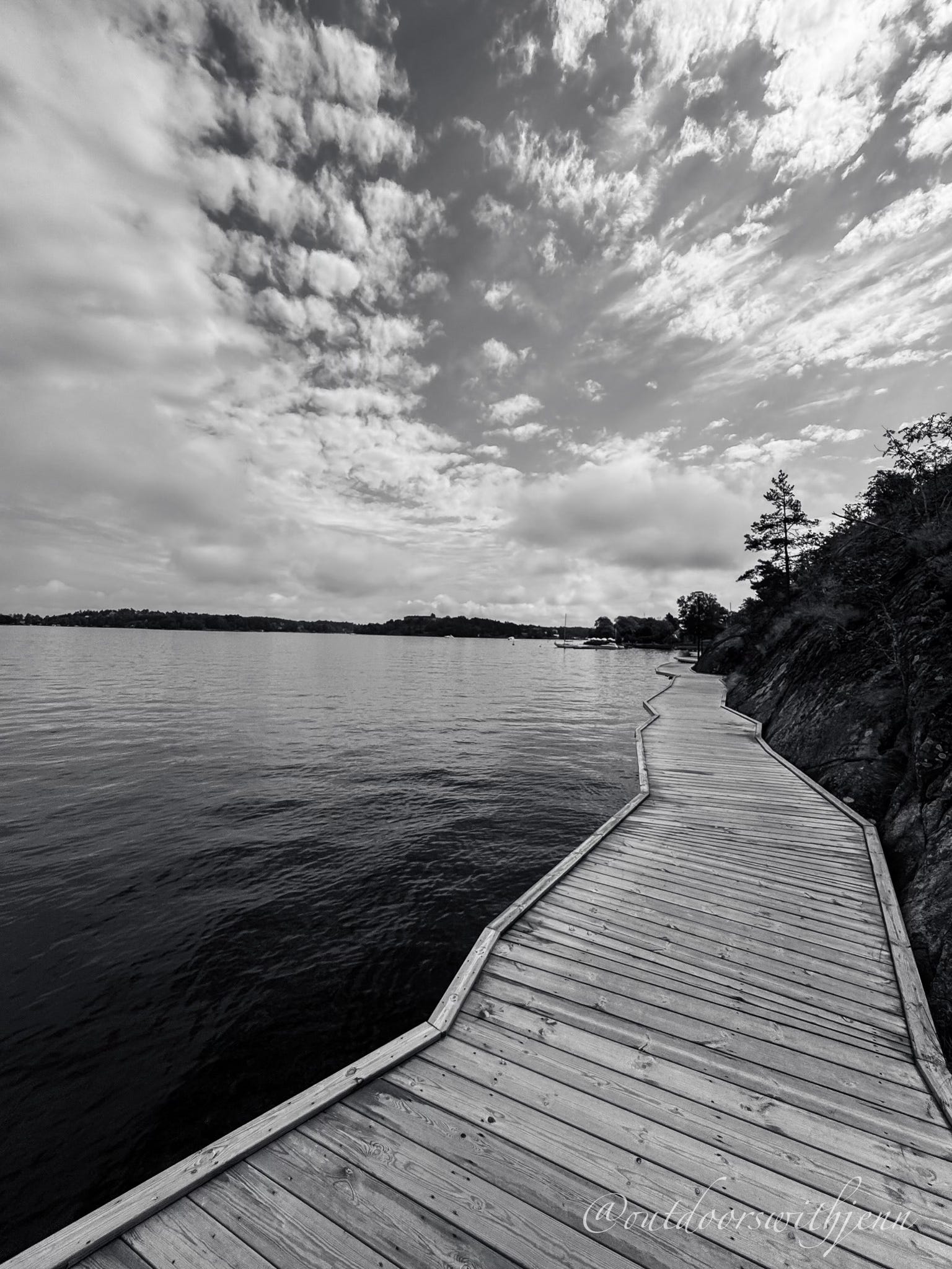 Story behind the photo: I found this immensely long and beautiful boardwalk hugging the coast of Vaxholm. Hardly anyone else was there. After a few people left the boardwalk, I shot several photos. Built against the raw stone, the boardwalk follows the rhythm of the shoreline.