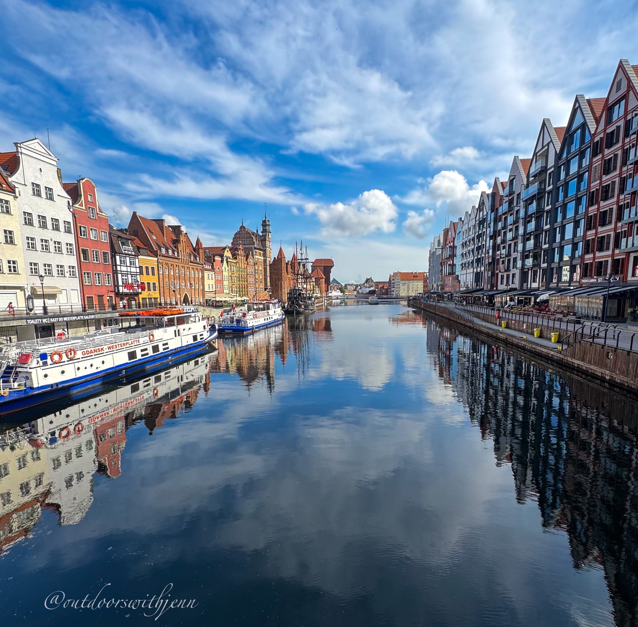 Story behind the photo: a view of the Martwa Wisla (river) from one of the many bridges in Gdansk. You can see the restored historic buildings on the left and the newer buildings on the right. A distinct reminder of the destruction caused by the war.