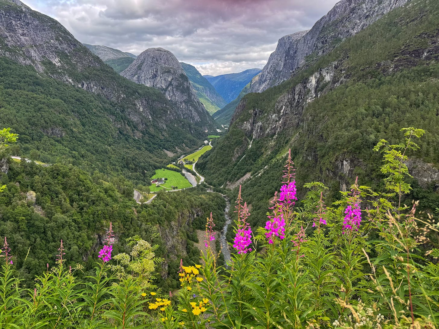 A journey into the Norwegian fjords brought us to the small village of Stalheim in Norway. We had lunch at the historic Stalheim Hotel. After lunch, I ventured out behind the restaurant and discovered this unbelievable valley - the Nærøydalen Valley. According to my research, this view has inspired artists, writers and travelers for over 200 years and is considered one of western Norway’s most iconic sights.